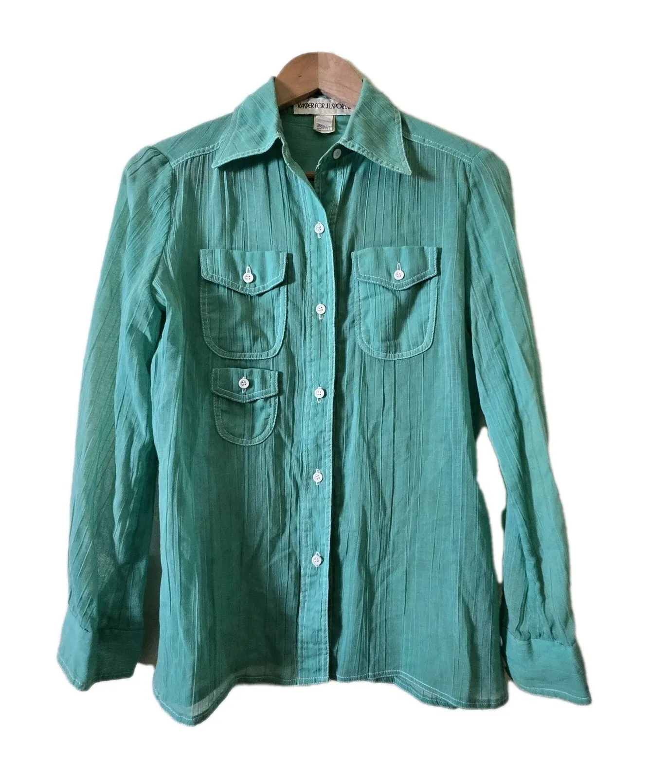No flaws, gently used, great pre-owned condition! Smoke free, cat friendly home - clothing not stored where she has access. Fast shipping 1-2 business days! Measurements (approx) No size tag Length 26" Sleeve from shoulder 23" Chest around 38" Shoulder 15" across Keywords: Kasper for JL Sport LTD, green shirt, button up shirt, long sleeve, pockets, vintage, blouse, casual, work, career, classic, retro, collared, lightweight