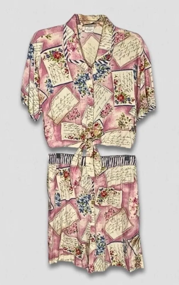This vintage Kathie Lee matching blouse and shorts set features a whimsical postcard and floral prin... Show more