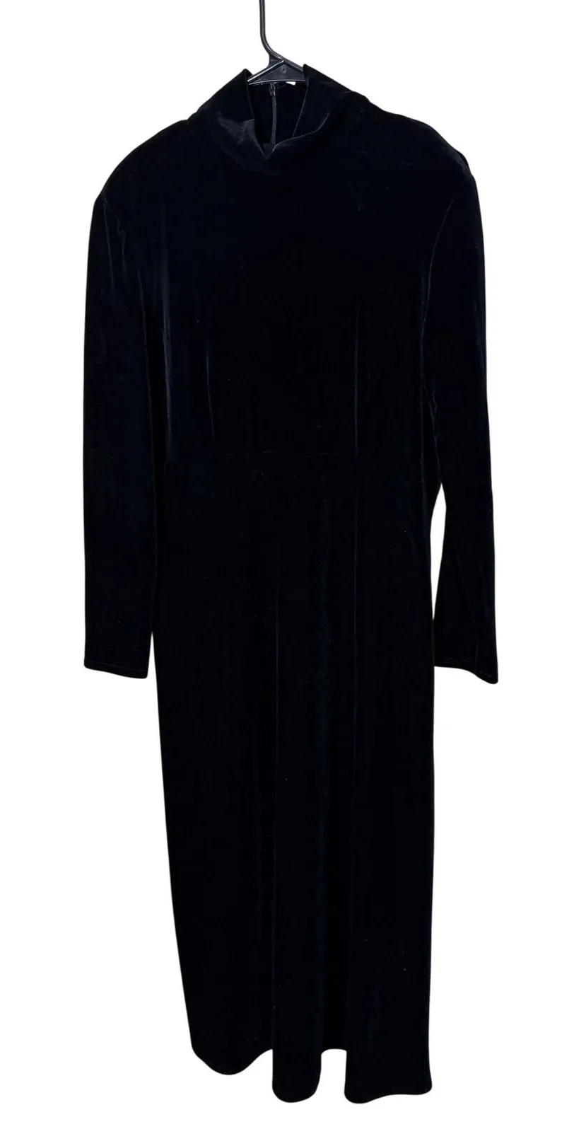 A classic black velvet maxi dress by KC Spencer. This elegant dress features a sophisticated mock neckline and long sleeves. The luxurious velvet fabric drapes beautifully, creating a flattering silhouette. A discreet zipper closure ensures a seamless look. The hemline falls to a maxi length, offering versatility and timeless appeal. Measurements laying flat • Bust: 20 1/2 in • Length: 52 in • Sleeve Length: 24 in Department: Women Occasion: Party/Cocktail, Formal Material: Polyester, Lycra Fabric Type: Velvet Neckline: Turtleneck Season: Winter, Fall Sleeve Type: Long Sleeve Keywords: velvet, elegant, classic, evening wear, cocktail dress, formal dress, winter fashion, sophisticated, goth, whimsigoth, vintage !!!Please See Measurements vintage sizes run smaller than modern sizes!!!
