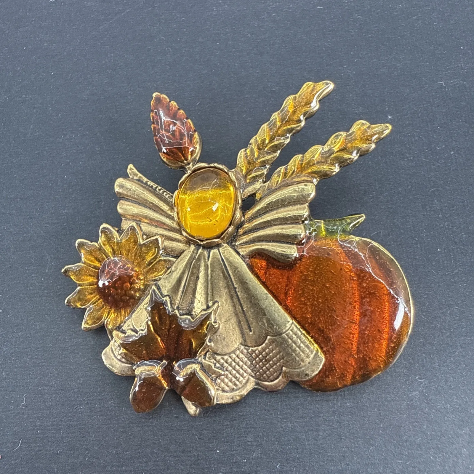 Vintage Kenneth Cole Autumn Pumpkin Angel Gold Tone Resin Brooch 2" Fall Harvest Brown - $16 - From Loren