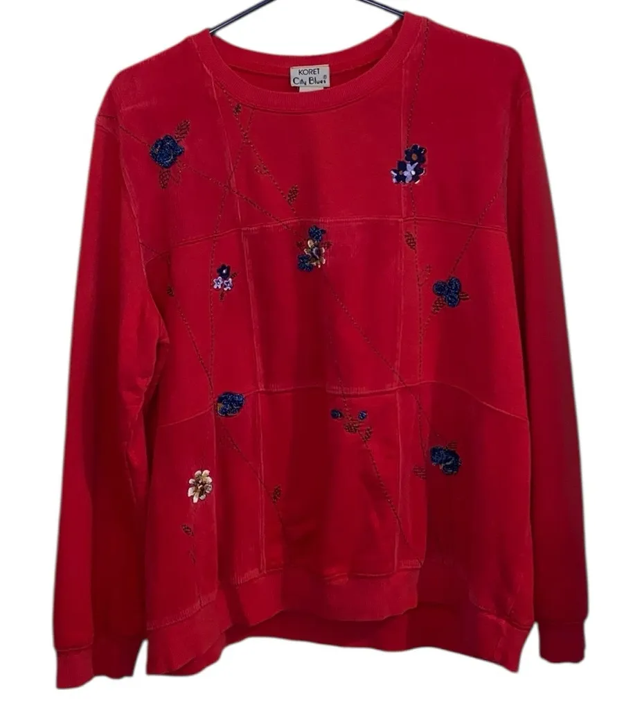 . Red sweatshirt with patches of Ribbed Velour & floral embroidery. Perfect for casual wear. cotton blend bo112425 25”long 25” pit to pit 44 “ waist band grandma core , cottagecore, country , art teacher , boho western