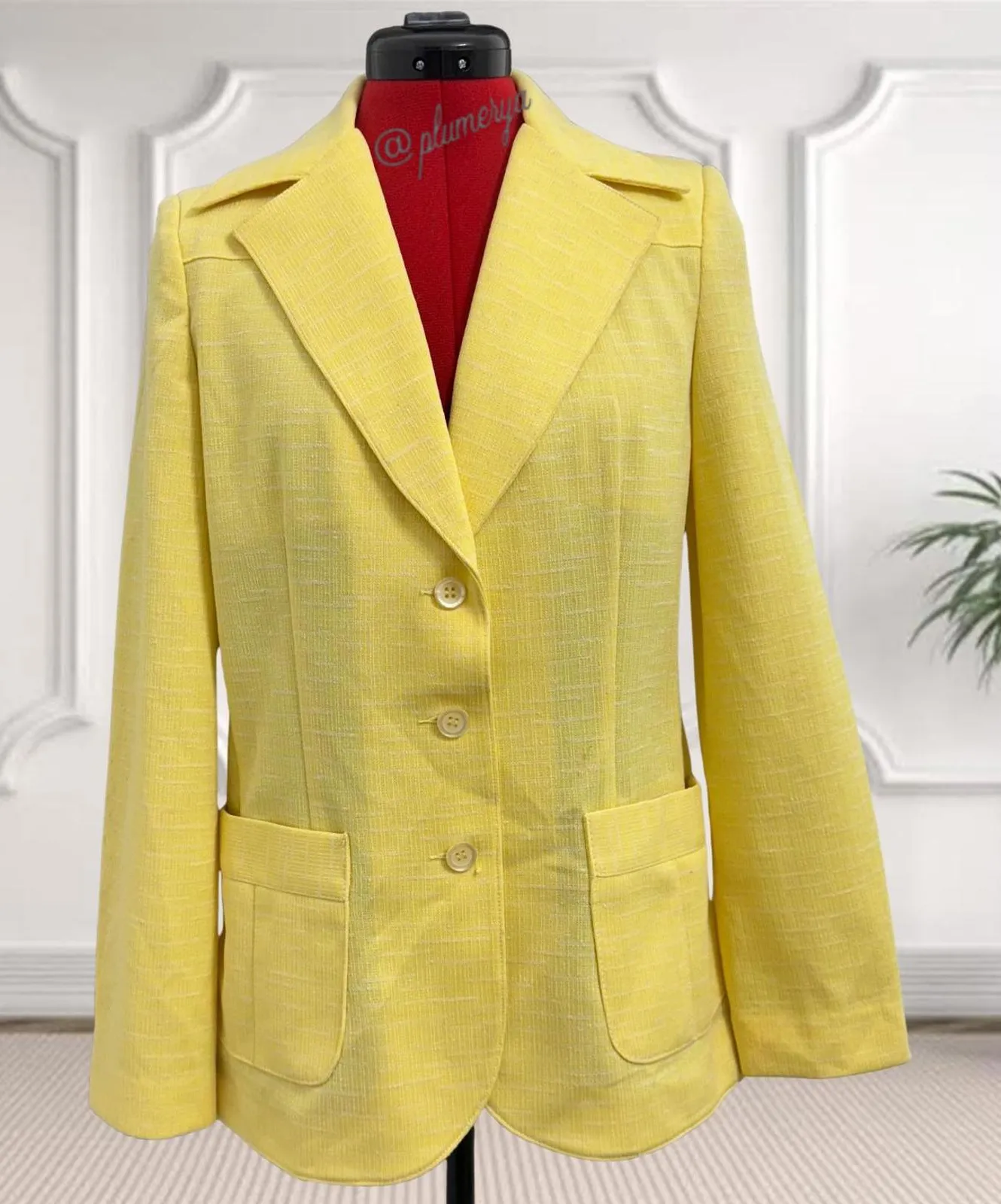 Size tag is too faded to read. Measurements are in inches laying flat Armpit to Armpit 17 Front Length 17 Back Length 27 Sleeve 24 Mannequin is a size Small. Blazer is either a Small or a Medium. As with all vintage items, signs of wear may be present. Blazer is in excellent condition and fully functional.