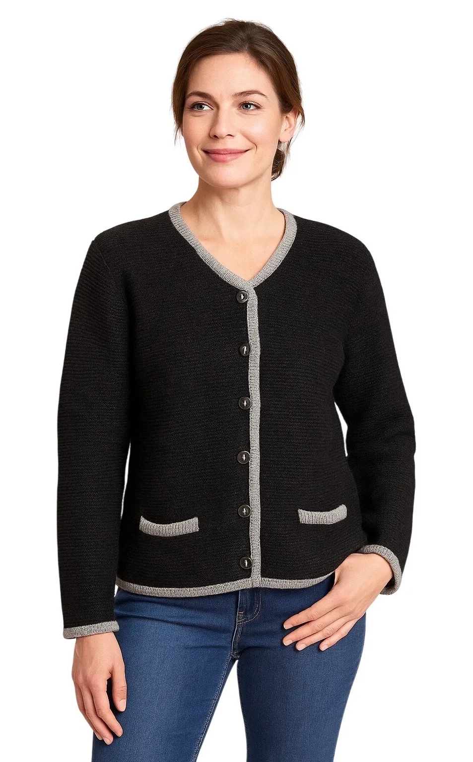 Vintage Krihinger Trachten-Strickmode women's cardigan crafted in Germany from 100% pure new wool (Schurwolle). Features a traditional alpine-inspired knit design with heathered gray contrast trim, button front, and classic pocket detail. A timeless, cozy layering piece ideal for fall and winter wear. • Brand: Krihinger Trachten-Strickmode • Origin: Made in Germany • Fabric: 100% Schurwolle (Pure New Wool) • Color: Charcoal black with light gray trim • Style: Traditional Trachten cardigan • Details: Button front, two front pockets, contrast edging • Size: 42 (approx. US Women's 10–12) Measurements (flat lay) Pit to pit 20" Length 26.5" Excellent vintage condition — clean and well maintained with no visible flaws. Cottagecore, Alpine Style, Bavarian Knitwear, German Wool Jacket, Rustic Cozy, Old Money Heritage, Classic Winter Wardrobe, Traditional Trachten Sweater Smoke-free, pet-free home. All items are washed/sanitized with hypoallergenic detergent and come ready to be worn!