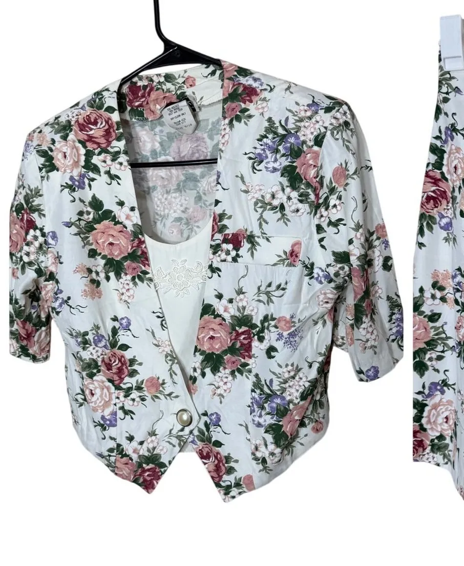 A chic vintage floral print two-piece set including a cropped blazer and a flared high rise shorts. The blazer features a removable notched lapel, short sleeves, a single button closure, and a decorative pocket. The shorts have a high waist and a flattering A-line silhouette with pleating at the front. Measurements: • Blazer Bust: 18 in • Blazer Length: 16 in front 19 at longest point • Blazer Sleeve Length: 11 in • Short Waist: 14 in • Short Length: 20 in • Short inseam: 7 in • Short Rise: 14 1/2 in Number of Pieces: 2 Piece Material: Acetate, Rayon Fabric Type: Floral Print Occasion: Casual Sleeve Length: Short Sleeve Type: Outfit/Set Accents: Button, Pleated Features: Shoulder Pads Keywords: vintage set, cropped blazer, women's fashion, retro style, summer outfit, spring fashion, feminine, garden party, cottagecore !!!Please See Measurements vintage sizes run smaller than modern sizes!!!