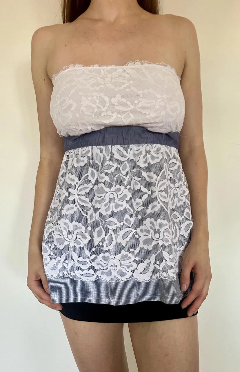 The most adorable picnic/cottage core/coquette tube top! Lovely muted blue ribbon to tie back and cinch the waist. Literally so darling! Dainty floral pattern on the lace overlay and supportive elastic band at the top. Brand is Intimissimi. Best fits a size small, or medium. The model is a 32D 26" waist, size small. Vibes are girly, summer, vintage doily, garden party, girl next door, & fairy. So obsessed with this cute top!! Message me with questions! #coquette #lace #cottagecore #vintage #picnic