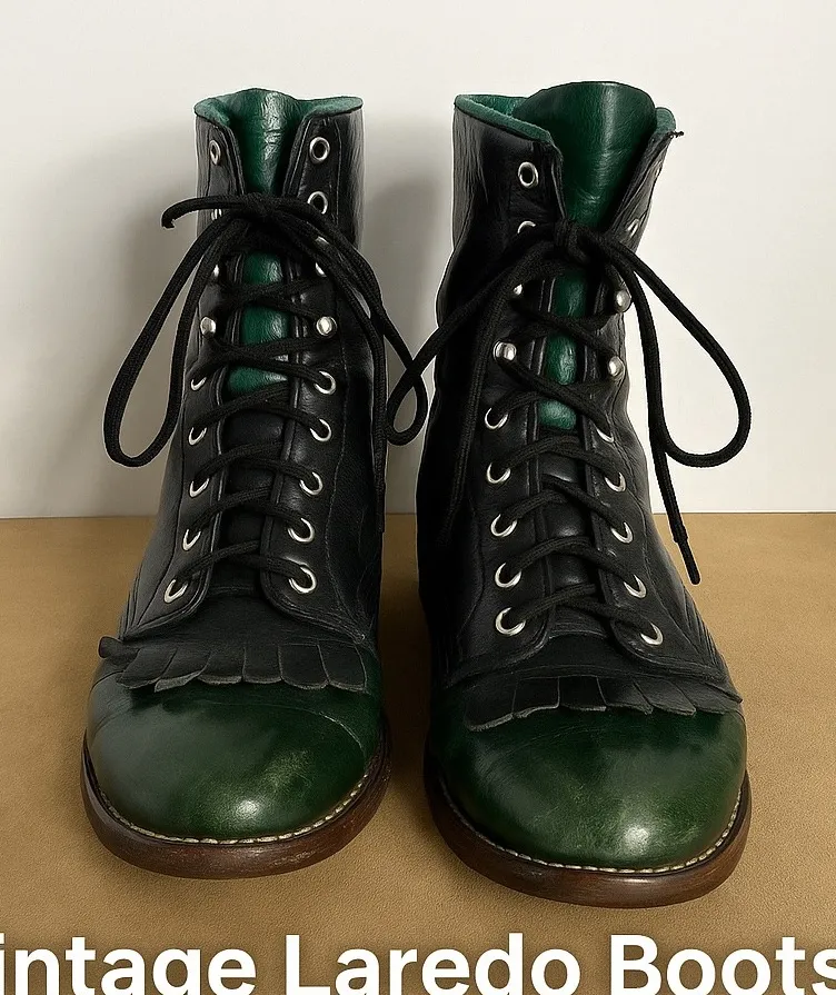 Step into vintage Western style with these rare Laredo lace-up boots. Made in the USA, style #359 features black and deep forest green leather with rugged kiltie fringe detailing, metal eyelets, and classic stitching. A unique color combo and sturdy design make these boots a standout for collectors or vintage fashion lovers. Details: • Brand: Laredo • Style: 359 • Size: US 6M / UK 4 / EU 37 • Color: Black & Green • Material: Genuine leather upper, man-made outsole • Height: approx. 8.5" • Condition: Preowned vintage condition — some scuffing and color wear consistent with age (see photos). Structurally solid with lots of character. Suggested Retail (newer models): ~$160 Unique black & forest-green leather whiskey-western lace-up boots with fringe. Rare colourway." #vintageboots #westernstyle #madeinusa