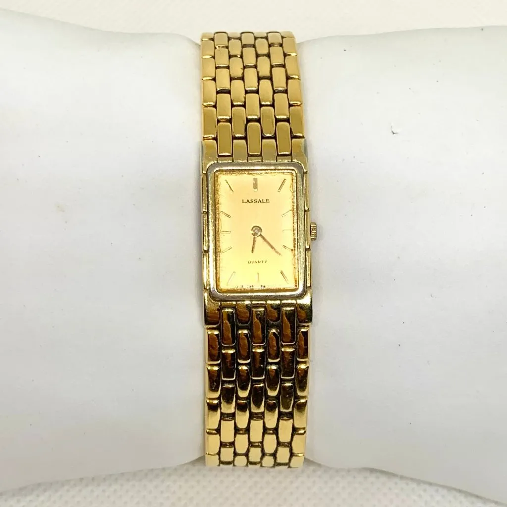 vintage Lassale Seiko quartz Japan women’s watch gold tone 15mm rectangular case 2E50-5189 , bracelet size 6.5” , in good used condition glass has scratches , works good battery installed