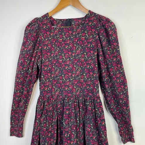 1980s Laura Ashley sweet floral dress, women’s US size 8 (this definitely runs small, please be sure to check measurements carefully!). In good pre-owned condition. 100% cotton corduroy, a pinwale or needlecord, super soft and velvety texture. This fabric has no stretch. Beautiful floral pattern, rose red, pink, purple, camel tan and green on a deep eggplant purple background. Square neckline, pouf shoulders, long sleeves with buttoned cuffs. Fitted waist with small gathered pleats all the way around. Concealed back zipper Side seam hand pockets Midi length skirt The bottom hem is partially unstitched, please see last photo. Chest: 16.5” underarm to underarm Back: 11.5” shoulder to shoulder across back Sleeves: 26” Waist: 14.5” across Hips: 29” across Length: 46” (hemmed sections) All measurements are approximate and were taken with the garment laid flat, fabric unstretched Smoke free home with pets Ladies proper modest British cottagecore farmhouse rustic cowgirl western eighties nineties 90s preppy classic