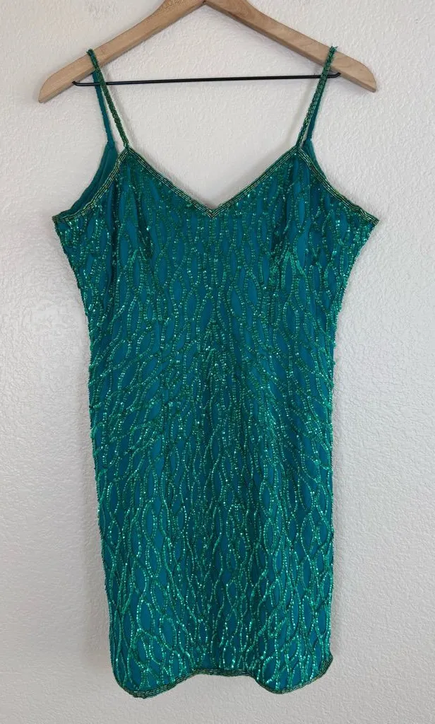 Beautiful vintage beaded sequin mini dress 100% silk Good vintage condition for some loose and missing beads and sequins (pictured) mostly on straps I’ve only seen this in the maxi dress version selling online for $250-$400. Or a short sleeve version. I haven’t seen it in this spaghetti strap sleeveless slinky mini dress style Approximate measurements Bust across 18” Waist across 14.5” Hips across 17” Length 34” V neck Low scoop back D417 Art deco glam Gatsby Ibiza Spain euro wedding guest holiday party glitz glam sparkle fancy, Wedding guest, fancy, formal, special occasion, night out, event, birthday, evening, party, dinner, dressy, cocktail, long, nice, prom, dance, hoco, date, date night, work event, black tie, red carpet, bachelorette, trip, vacation, party, Vegas, going out, nightclub