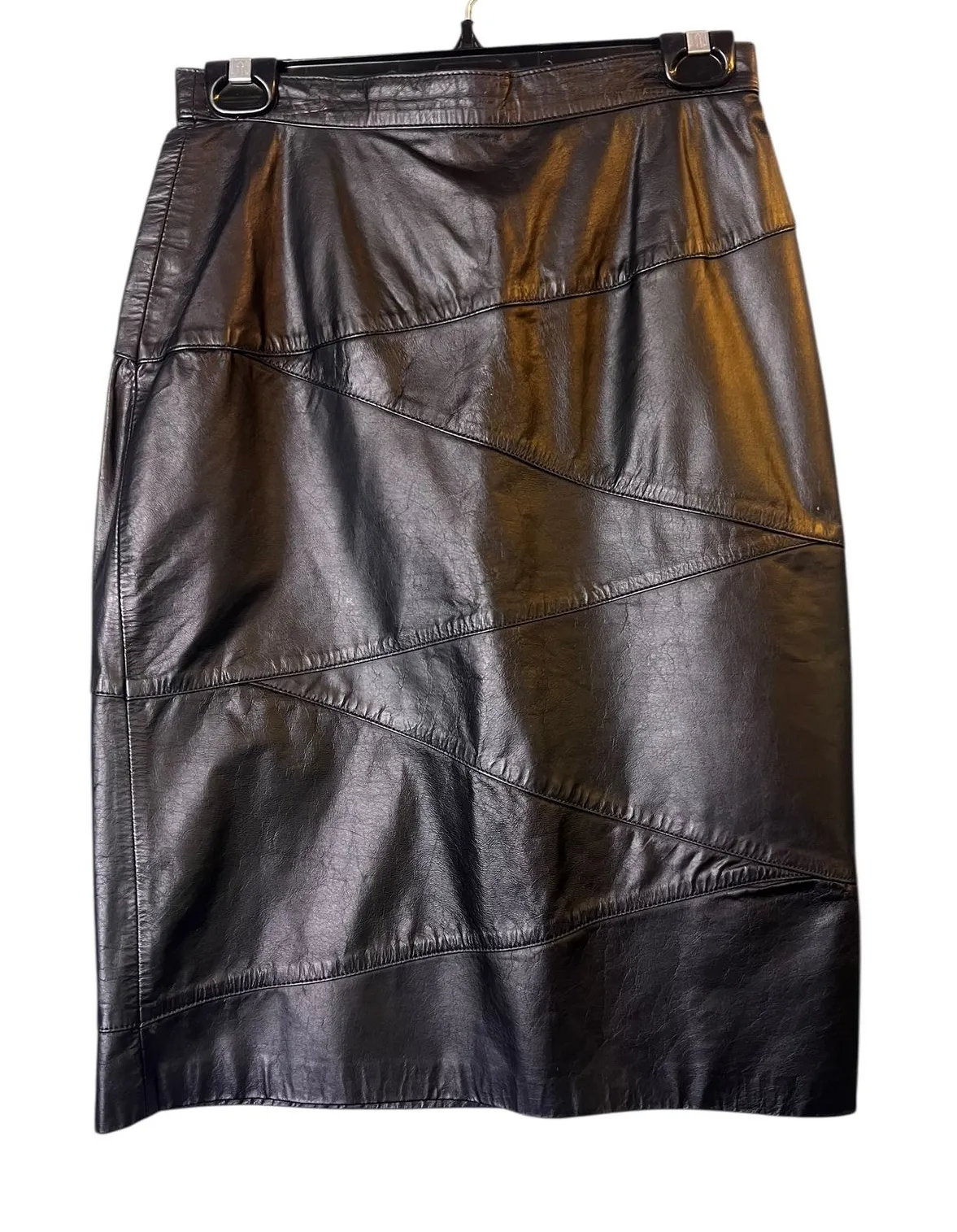 Command attention in this striking Laurice leather skirt, a symphony of textures and angles. Expertly pieced together from diagonally-cut panels, this midi-length pencil skirt sculpts a flattering silhouette that exudes confidence and sophistication. The supple leather drapes beautifully, promising both comfort and a luxurious feel against the skin. A timeless black hue ensures versatility, making it a seamless addition to any wardrobe. Imagine yourself commanding the boardroom with poise, or turning heads at a sophisticated cocktail party. This skirt is your secret weapon for making a lasting impression. Type: Skirt Style: Straight & Pencil Skirt Length: Midi Color: Black Department: Women Pattern: Solid Material: Leather Accents: Button, Zipper Fabric Type: Leather Features: Lined Character: Classic, Stylish Closure: Zip Occasion: Business, Party/Cocktail, Workwear Keywords: leather skirt, pencil skirt, midi skirt, black skirt, panelled skirt, career wear, office wear, size 10, size 6, Laurice, genuine leather, Dominican Republic, vintage skirt, classic skirt, stylish skirt