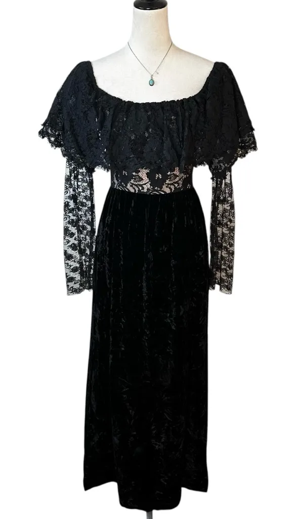 š¤ Vintage 60s/70s Black Velvet & Lace Off-Shoulder Maxi Dress Condition: Good vintage condition ā minor expected wear consistent with age. No major flaws seen. Lace is beautifully intact. Union Made ⢠Lee Jordan New York ⢠Labeled size 12, runs very small. Please see measurements below. A breathtaking true vintage formal gown featuring dramatic gothic romance. This piece blends crushed velvet + sheer floral lace + an off-the-shoulder neckline, giving it the perfect Victorian witch, Ren Faire, dark romantic, Morticia-esque vibe. Absolutely dreamy for collectors, costume stylists, gothic brides, period theatre, or a unique formal look. ⨠Features ⢠Union Made ā Lee Jordan New York ⢠Off-the-shoulder neckline with layered lace overlay ⢠Sheer floral lace sleeves + bodice panel ⢠Crushed velvet maxi skirt ⢠Vintage lot tag present ⢠Back zip closure + fully lined skirt ⢠Rare gothic ballroom / Opera / Edwardian influence ⢠Dark Academia ⢠Victorian Goth ⢠Witchcore ⢠Cottage Gothic ⢠Ren Faire Chic š Measurements (flat approx) P2P: 15.5ā Length: 54ā Waist: 12.5ā Hips: 20ā Best fits modern XS/S depending on desired fit ā please refer to measurements. Keywords: Gothic Maxi ⢠Victorian Witch ⢠Velvet Dress ⢠Dark Romance ⢠Morticia Addams ⢠Black Lace Dress ⢠1960s Gown ⢠1970s Witchcore ⢠Masquerade Ball ⢠Holiday Formal ⢠Opera Night ⢠Dark Academia ⢠Ren Faire Clothing ⢠Vintage Evening Gown ⢠Dramatic Sleeves