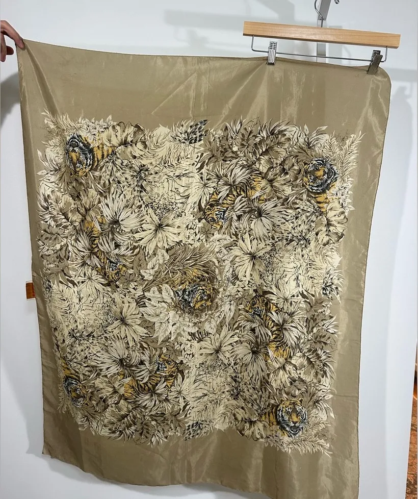 credible vintage silk scarf featuring a vivid tiger and tropical foliage print — a bold jungle motif... Show more