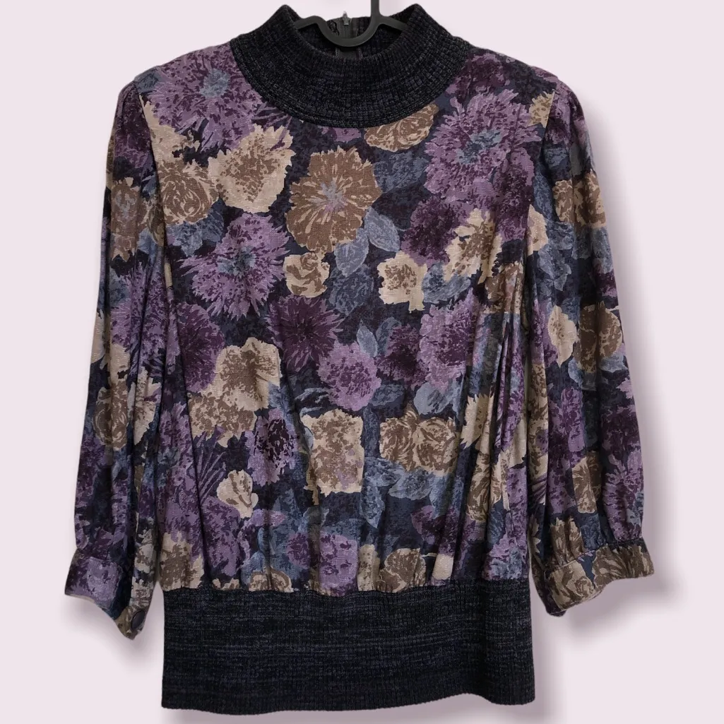 Vintage Leslie Fay floral knit mock neck ribbed waist‎ 3/4 sleeve blouse s/m Purple - $37 - From Diana