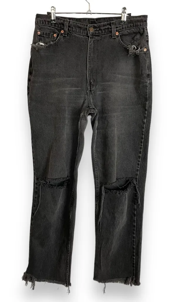 Vintage 90s faded black / gray Levi's jeans with rips in the knees, back thigh, and pockets and raw... Show more