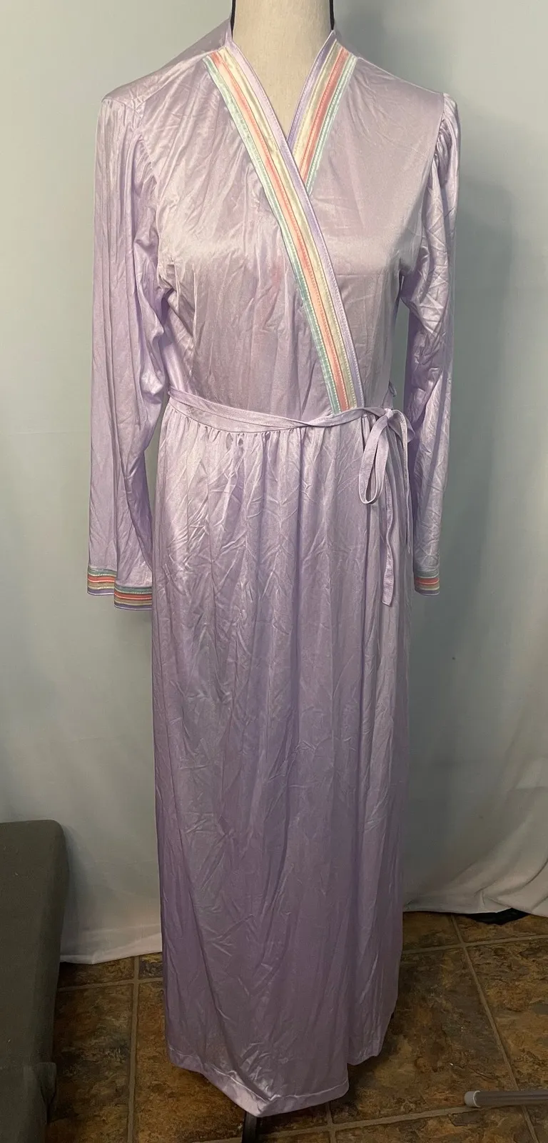 Vintage robe in a soft lilac hue, featuring a flattering wrap design with a coordinating belt for an adjustable fit. The robe boasts a striking rainbow trim along the collar and cuffs, adding a playful touch to the elegant silhouette. Perfect for relaxed mornings at home, luxurious spa days, or as a chic cover-up for evening lounging. MEDIUM Type: Robe Department: Women Style: Kimono Theme: Retro, Rainbow, Pastel Pattern: Solid Material: Polyester Fabric Type: Satin Sleeve Length: Long Sleeve Season: Fall, Spring, Summer Closure: Tie Accents: Bow Keywords: vintage robe, lilac robe, long robe, lounge wear, womens sleepwear, rainbow trim, belted robe, wrap robe, retro robe, pastel robe, vintage clothing, womens fashion, nightwear, sleepwear, loungewear
