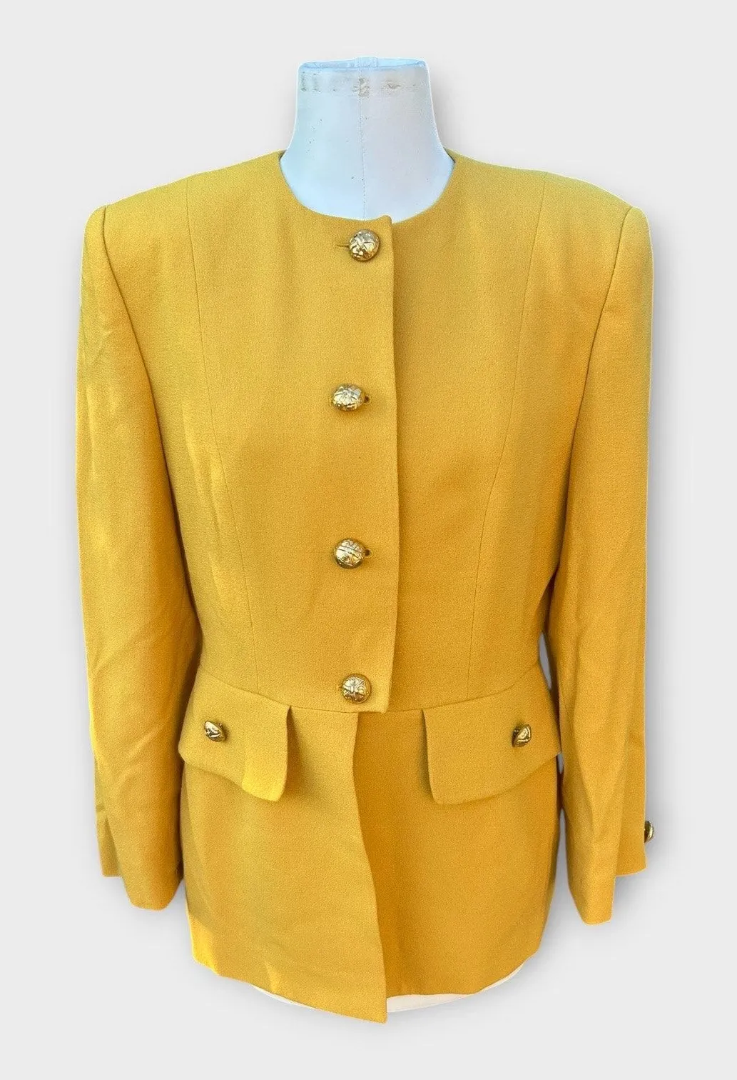 Sophisticated vintage Lillie Rubin wool mustard yellow blazer with gold buttons. Women's size 14. Th... Show more
