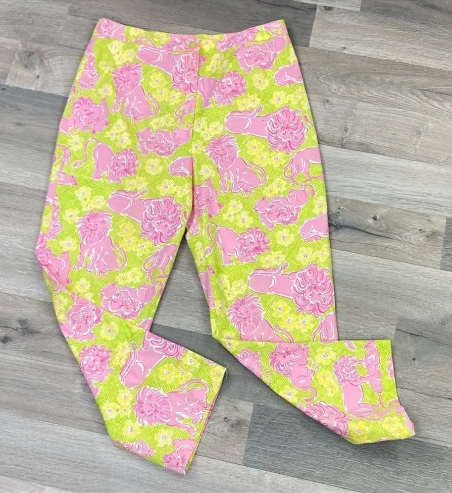 Lilly Pulitzer Vintage White Label Lion Print Crop Capri Pants Flat Front Size 4 Bright lime green... Show more