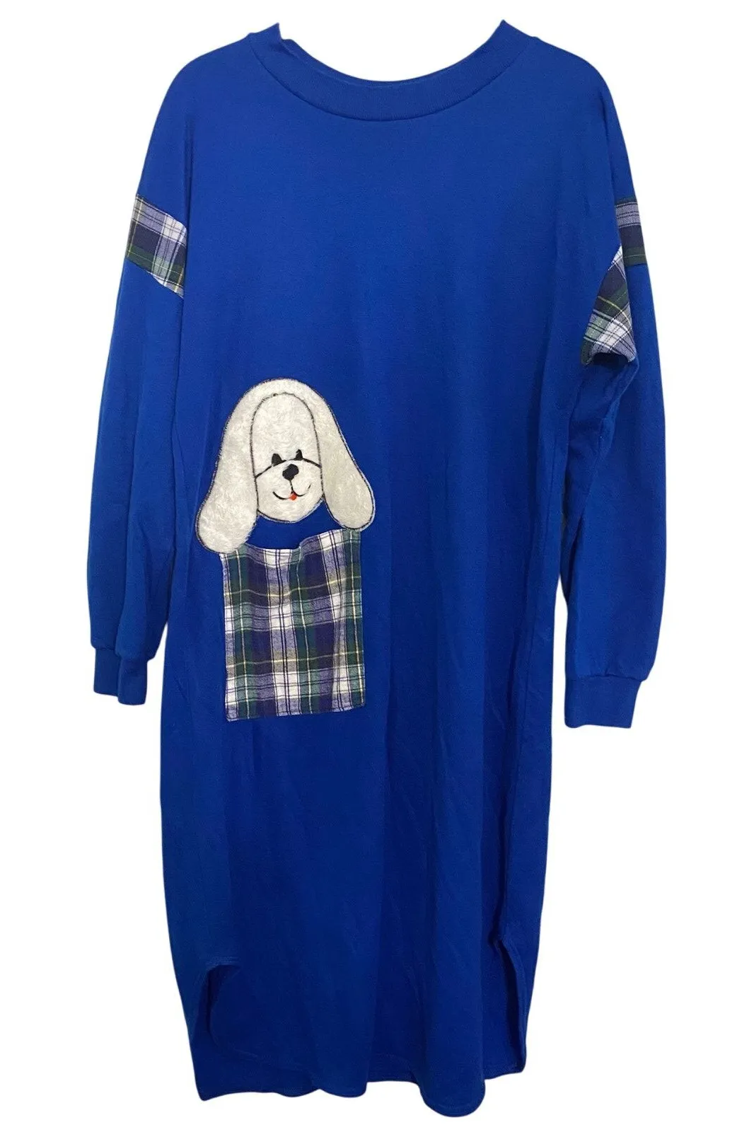 Adorable vintage Lindsay Jordan long nightgown / lounge dress, marked Size Medium (tag print is faint but readable). Cozy cobalt blue knit with a soft fleece interior, featuring a fuzzy dog appliqué and plaid pocket with matching plaid sleeve accents. Relaxed, oversized 90s fit — warm, soft, and perfect for winter lounging. Chest: 22” flat Gently pre-owned vintage condition • One small flaw: tiny hole on back (see close-up photo) name written on inside back collar • Inside fleece is soft and intact • No major stains or tears • From a smoke-free home Fast shipping from non-smoking home Loungewear, vintage pajamas, vintage nightshirt, cozy fleece pajamas, dog applique dress, kawaii dog top, puppy nightgown, 90s sleepwear, oversized nightshirt, warm winter lounge dress, novelty graphic sleep shirt, plaid accent pajama dres