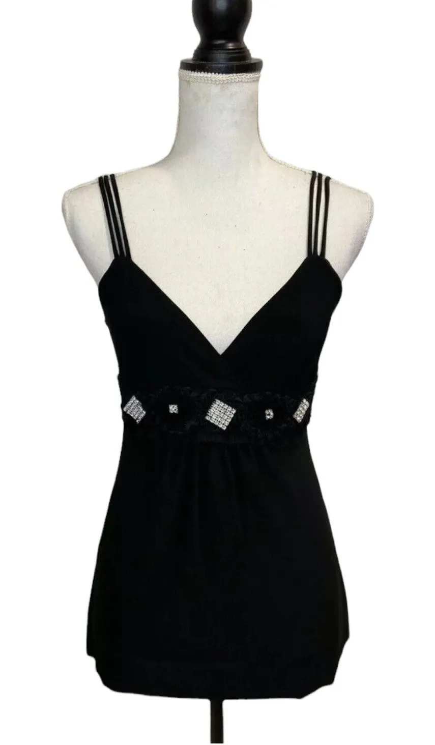Brand: Lipstick Item Type: Tank Top Gender: Womens Size: Small Color: Black Material: Polyester Spandex Pattern: Solid Style: Rhinestone Bling Clubwear Features: Triple Spaghetti Straps, Stretch, V Neck Neckline: V Neck Sleeve Style: Sleeveless Closure: Pullover Occasion: Party Clubwear Night Out Department: Women Fit: Classic Theme: Glam Accents: Rhinestone Strap Type: Spaghetti Fabric Type: Knit Measurements (laid flat): Bust (armpit to armpit): ~14.5 in Length (top of strap to hem): ~21 in Excellent pre-owned condition - see pics and ask questions for more details. y2k glam edgy sparkle nightout clubwear festival chic sexy