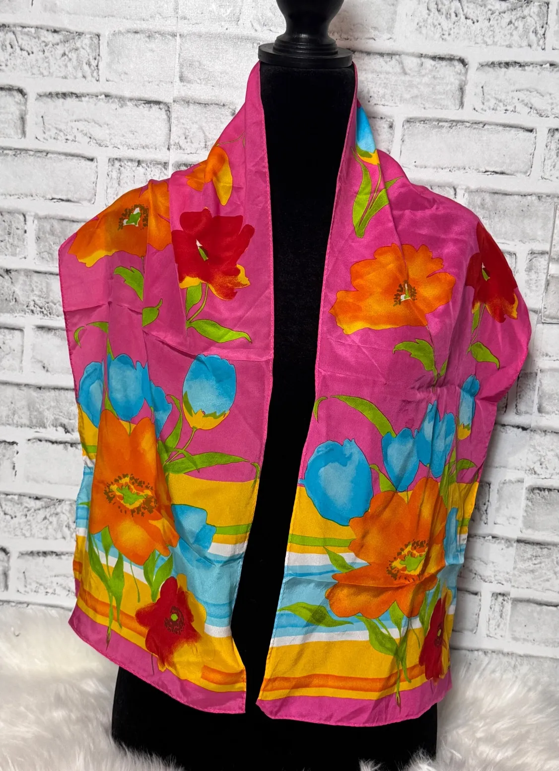 Vibrant silk scarf featuring a bright and bold floral print. The scarf showcases a lively array of o... Show more
