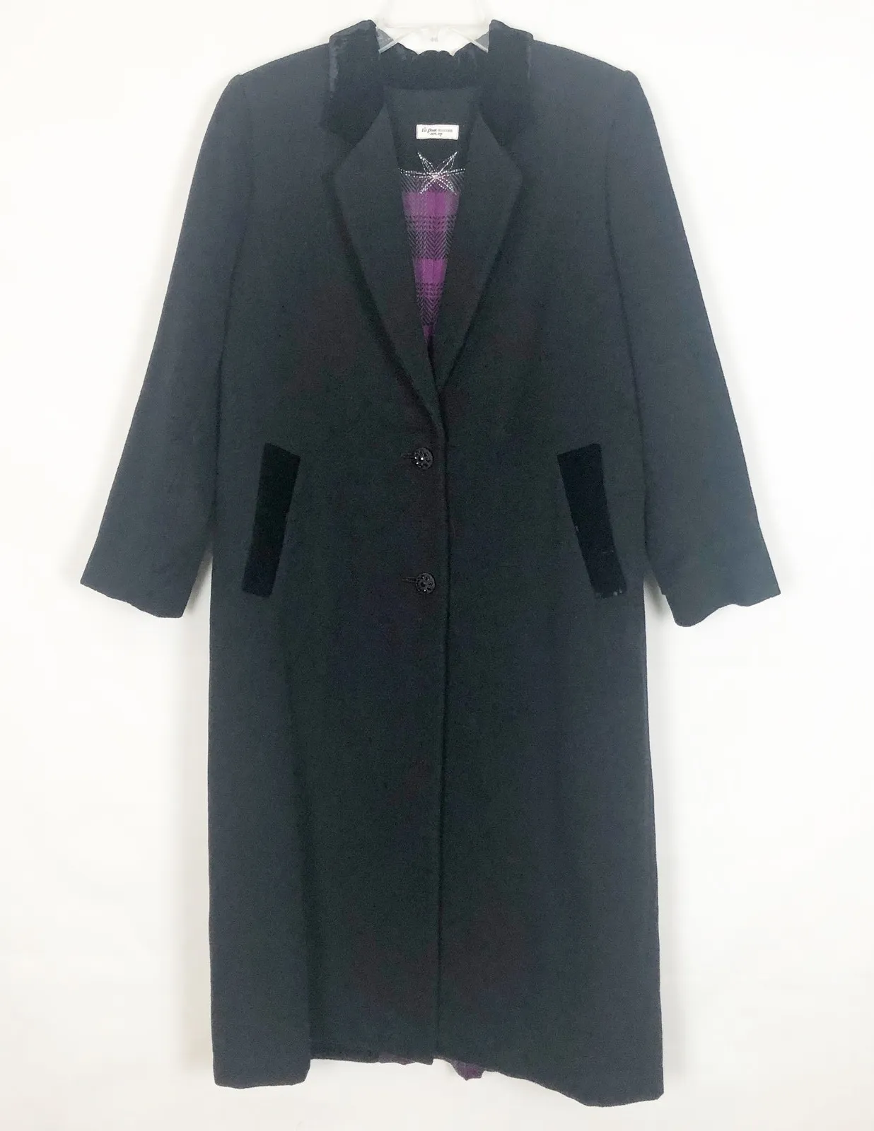 Liz Park Boutique trench coat in black. Collared. Long sleeves. Plaid lining. Two-button front. Side pockets. Includes shoulder pads. Heavy material. Does not have a material tag attached, but feels a wool blend. In good used condition. No stains, tears or holes. No material tag. Wool blend feel.