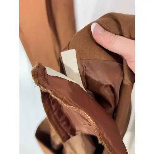 Step into timeless style with this vintage 1990s Lizwear women’s two-piece suit set featuring a structured safari-style blazer and high-waisted belted pants. Made from a breathable 57% linen, 43% cotton blend with a full polyester lining, this set is perfect for warm-weather styling or adding retro flair to your everyday wardrobe. Blazer Features: • Rich chestnut brown color • Button front with flap pockets • Structured shoulder with light padding • Safari/outdoorswear influence • Material: 57% linen, 43% cotton; lining: 100% polyester • Approx. pit to pit: 18” • Approx. waist: 16.25” • Approx. length: 27.5” Pants Features: • High-rise pleated front • Original faux croc embossed belt with brass buckle (cracking present) • Zip fly with button closure • Straight leg fit • Approx. waist: 12” flat (24” around) • Inseam: approx. 29.5” • Rise: approx. 13” Condition: Overall great vintage condition. Some wear to the belt (cracking in the faux leather), but otherwise clean and structurally sound. No major flaws. #90sStyle #VintageSuit #LinenSet #SafariStyle #CoastalCowgirl #BrownAesthetic #Lizwear #Cottagecore #VintageBlazer #VintagePants #TwoPieceSet #Y2KPrep #RetroWorkwear