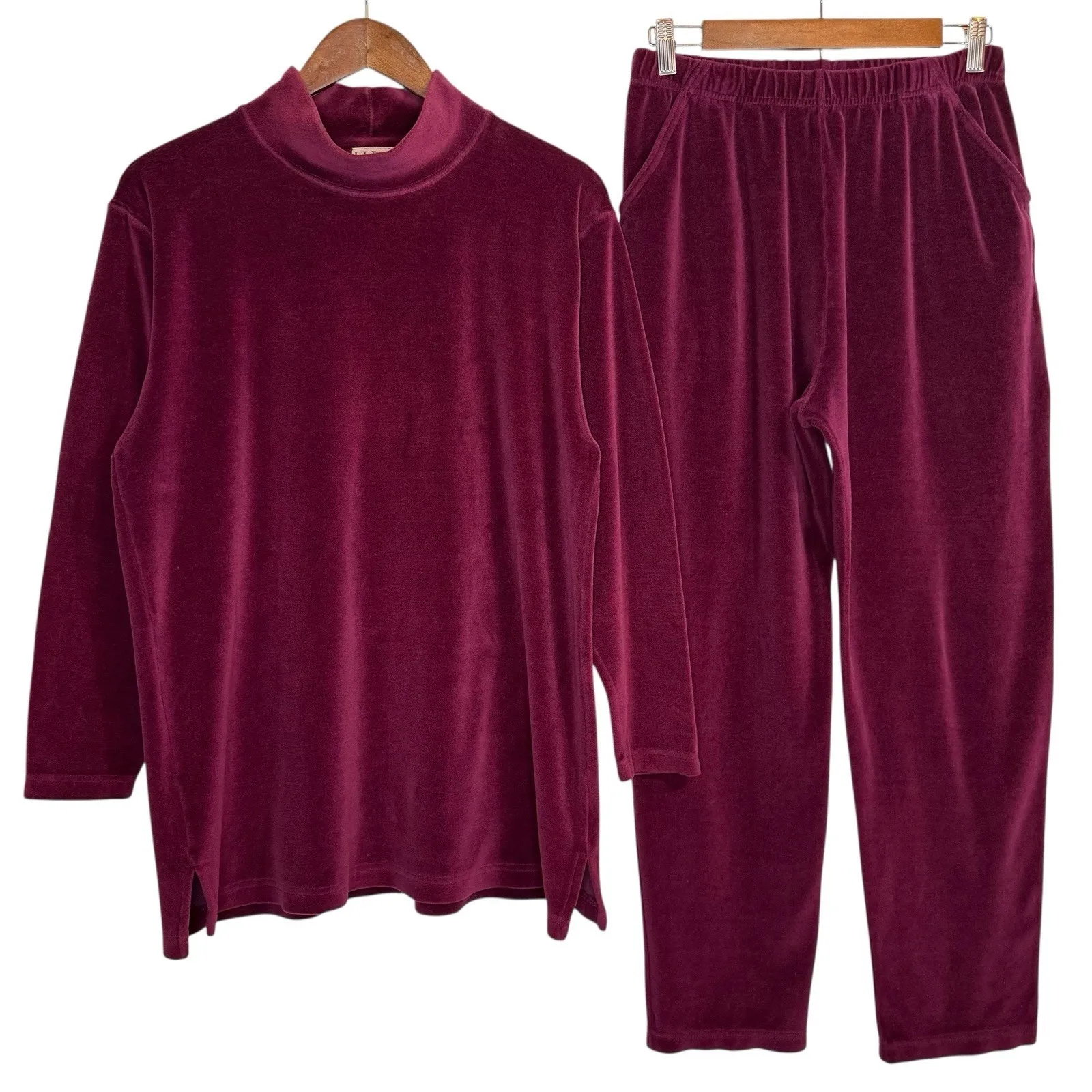 Vintage L.L. Bean velour lounge set / tracksuit in rich burgundy. Includes long-sleeve mock neck pullover top with side vents and matching elastic-waist pants with pockets. Made in the USA — a true classic from L.L. Bean's late 80s–early 90s era, known for timeless quality and comfort. Soft cotton-blend velour (80% cotton / 20% polyester) with a plush handfeel and subtle sheen. Gently worn consistent with age and normal use — no major flaws, just light wear adding to its authentic vintage character. A perfect cozy set for lounging, travel, or that retro Y2K athleisure aesthetic. Measurements are shown in photos. Features: Made in USA 80% Cotton / 20% Polyester Color: Deep Burgundy / Wine Size: Women's Medium (pant tag notes Petite Medium) Elastic waist, side pockets, side-vent tunic top Soft velour texture Classic 80s–90s L.L. Bean quality Keywords L.L. Bean velour set, vintage lounge set, 80s tracksuit, 90s athleisure, made in USA, burgundy velour, retro cozy set, soft cotton blend, mock neck top, velour two-piece, vintage loungewear, Y2K velour, classic vintage comfortwear