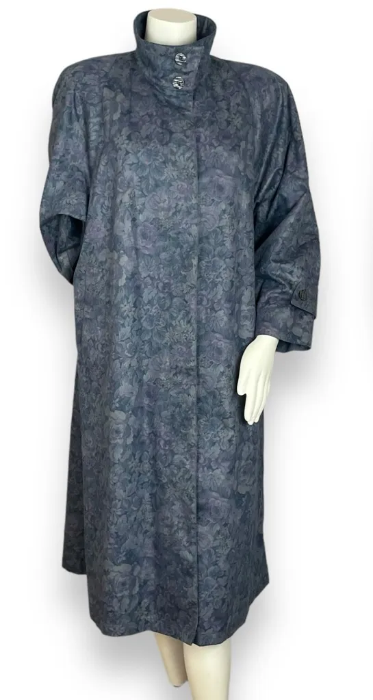 Vintage London Fog long jacket with collar that can fold down or stand up buttoned. Hidden textured buttons partway down the front with matching ones on cuffs and in back. Spare buttons inside. Side pockets. Union made. Moody, retro piece, perfect for early fall. Condition: Gently preloved, no holes or stains. Size: Petite 6. See approximate measurements for best fit. Pit to pit: 23" Length from shoulder to hem: 45.5 Cleaned and from a smoke-free home. Fast shipper!