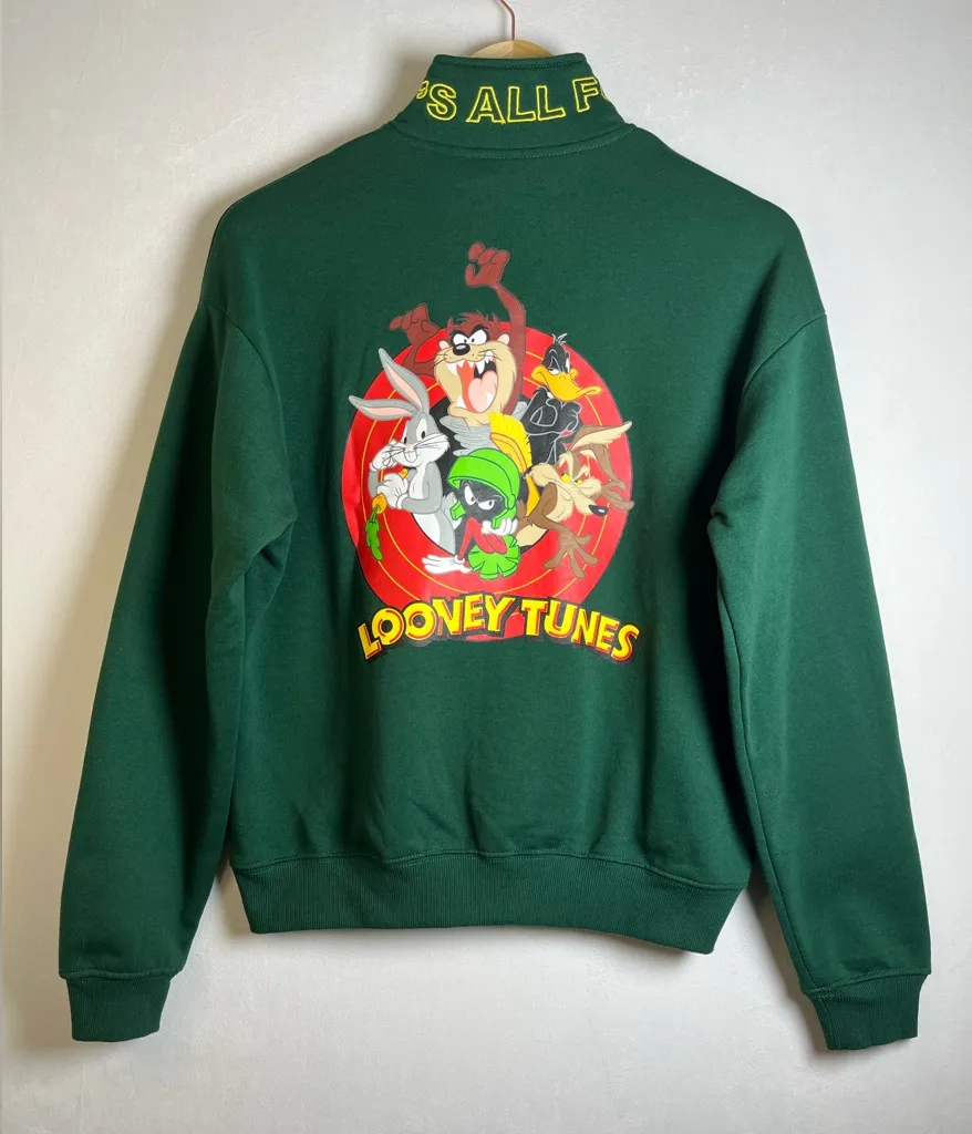 Bring classic cartoon nostalgia to your wardrobe with this officially licensed Looney Tunes quarter-zip sweatshirt in forest green. Features embroidered collar detail and large back graphic with your favorite characters — Bugs Bunny, Taz, Daffy Duck, Marvin the Martian & Wile E. Coyote. Super cozy fleece interior, premium print, and retro streetwear vibes. Harder-to-find design! Size: S (fits like a relaxed/standard streetwear fit) Condition: Brand new without tags Features • Forest green fleece sweatshirt • Quarter-zip with metal ring zipper • Embroidered collar detail • Front graphic: Bugs Bunny + “That’s All Folks!” • Large Looney Tunes characters graphic • 60% Cotton / 40% Polyester • Official licensed Looney Tunes merchandise Measurements (approx.) • Pit to pit: 21 in • Length: 21 in New without tags! No cracking in the print and no major wear. Ready to wear! Perfect for: Streetwear • Vintage lovers • 90s nostalgia • Cartoon fans • Collectors • Oversized aesthetic • Cozy casual outfits Looney Tunes sweatshirt, Bugs Bunny sweater, Marvin Martian shirt, vintage Looney Tunes, cartoon sweater, retro quarter zip, animated characters sweatshirt, That’s All Folks, 90s style sweatshirt, fleece pullover, graphic sweatshirt, cozy vintage sweater, green pullover, streetwear sweatshirt, oversized sweater, Warner Bros sweater, Taz sweatshirt, Daffy Duck sweater, nostalgic apparel