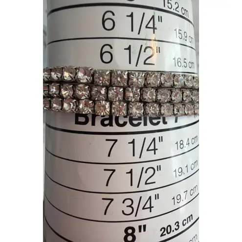 A timeless set of three silver stretch rhinestone bracelets offering a blend of elegance and versatility. Ideal for elevating formal or casual attire. • Stretchable design for adjustable fit • Durable silver-tone construction • Sparkling rhinestone embellishments • Lightweight and comfortable • Sitting at 6 3/4" Excellent preowned condition