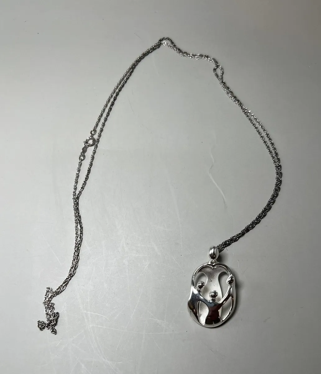 Vintage Loving Family Necklace Sterling Silver Pendant 1995 Mother Child Gift Boxed Condition: New. Missing one side of the box Sterling silver abstract family pendant representing mother and two children Pendant marked 1995 Carlisle Jewelry Company, Albuquerque, NM Comes on a delicate silver tone chain with traditional clasp Presented in original "Loving Family" gift box with themed background Perfect as a sentimental Mother's Day, family, or birthday gift Stylish keepsake jewelry and collectible piece Bx