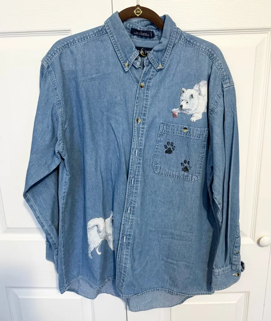 Stylish denim blue button down shirt featuring a unique animal design on the front and back. Perfect for casual outings. Like new, graphics are great! Made in Pakistan, 100% cotton.