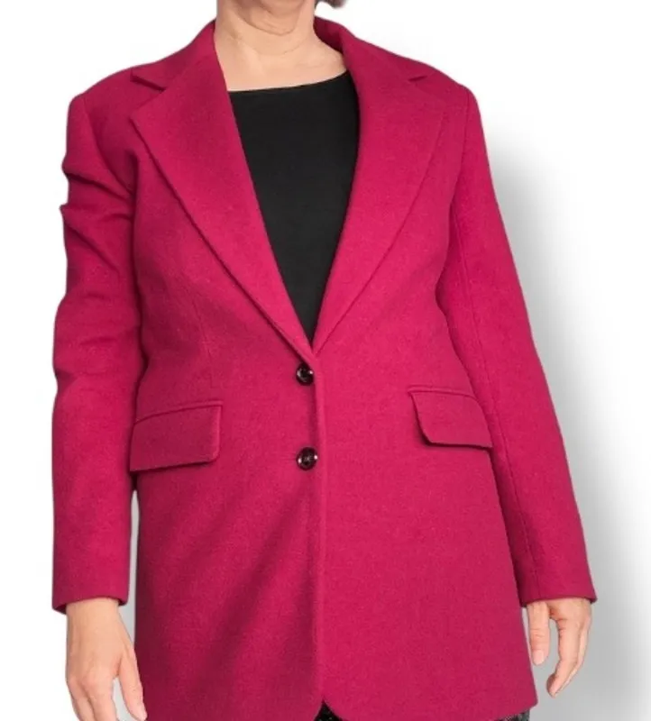 Vintage Wool Blend Coat Holiday winter layer Size Small Burgundy leaning hot pink color Longline blazer coat Notched lapel neckline Two button front Front flap pockets Fully lined 75 percent wool 25 percent nylon Made in USA Flat Lay Measurements