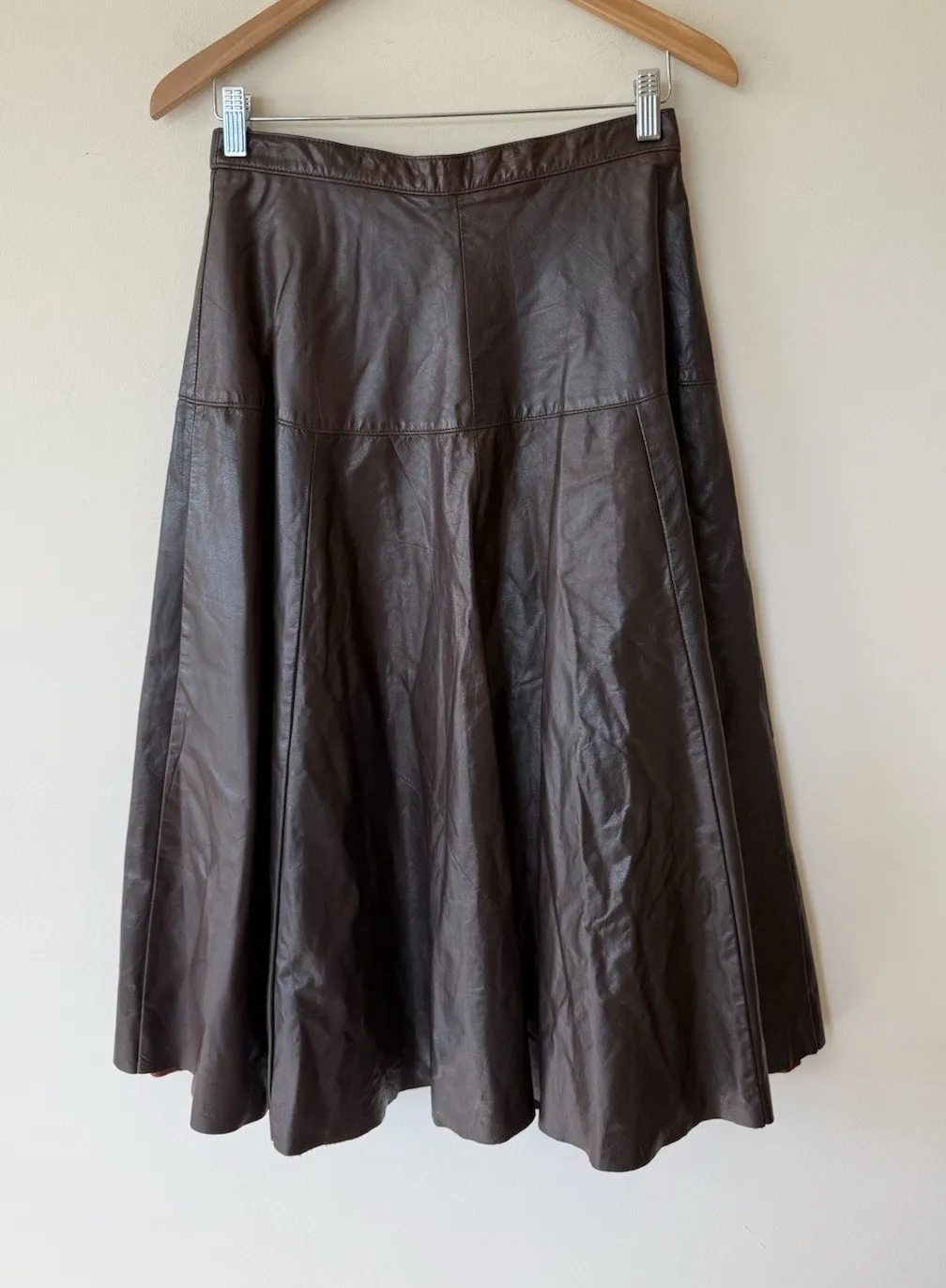 Vintage Maglia Brown Leather long A-Line Swing Flowy skirt is a classic piece made in the United States. This lined skirt features a brown leather material with a waist to hem length of 31 1/2 inches. The size S and regular size type make it a versatile option for women looking to add a touch of luxury to their vintage wardrobe. Smoke free and pet free home