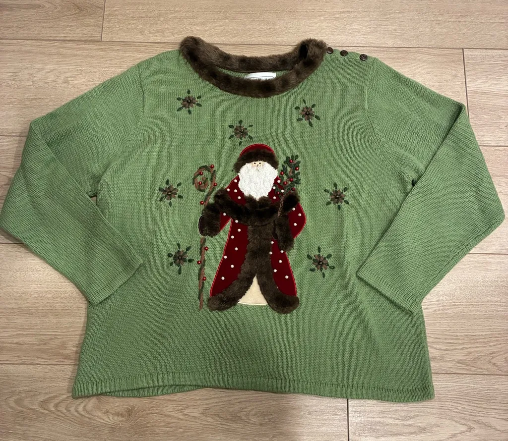 Vintage Mandal Bay Ramie Faux Fur Santa Christmas Novelty Sweater Size XL Green - $35 - From Sarah