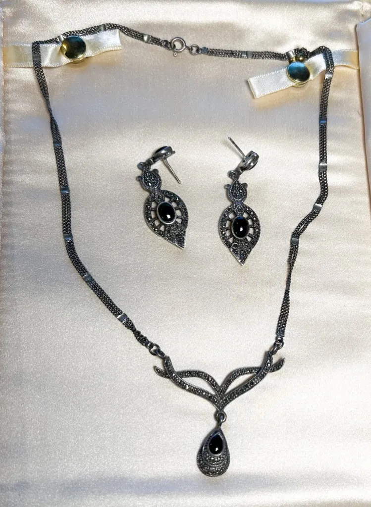 This is a really lovely set!! It’s been sitting in my jewelry box for years unworn so it’s time to sell. Vintage art deco style sterling silver necklace and earring set by Marsala Co. In nice vintage condition.