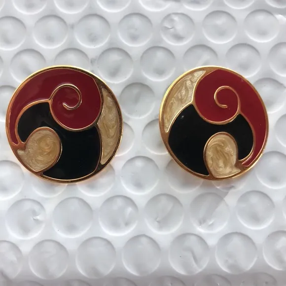 Vintage MCM Monet Red Black Beige Gold Enamel Pierced Earrings 1 1/4" Round Brown - $25 - From Dana