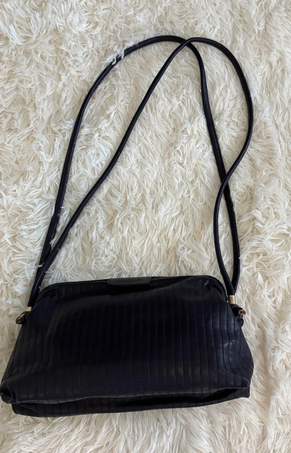 Chic sophistication arrives in the form of this quilted shoulder bag, exuding timeless elegance with its Eggplant hue and subtle gold accents. The vertical quilting adds a touch of texture and visual interest, while the sleek silhouette complements any ensemble. Designed with a secure clasp closure and a convenient interior pocket, it's perfect for keeping your essentials organized. Carry this versatile bag to a sophisticated dinner, a weekend brunch, or a stylish travel adventure. Exterior Material: Leather Style: Shoulder Bag Exterior Color: Navy Blue Department: Women Lining Color: Eggplant Handle/Strap Material: Leather Lining Material: Leather, Fabric Hardware Color: Gold Pattern: Quilted Closure: Clasp, Kiss Lock Keywords: Leyers, Shoulder Bag, Quilted, Navy Blue, Gold Accent, Clutch Purse, Vintage, Designer, Leather Bag, Evening Bag, USA Made, Crossbody