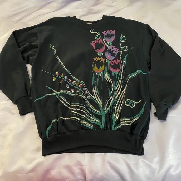 Vintage Michelle Rose glitter floral tulip sweatshirt with a soft fleece lining Black Size L - $43 - From Kristal