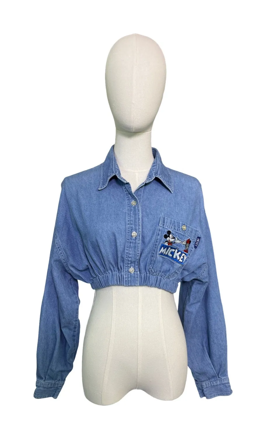 Adorable and rare vintage Mickey Unlimited cropped denim shirt from the 1990s by Jerry Leigh. Made from 100% cotton with elastic at the waist for a boxy, cinched silhouette. Features embroidered Mickey and Minnie patch on the chest pocket and classic snap button closures. Tag size L, fits like a modern Medium depending on desired fit. Excellent vintage condition — soft, broken-in denim with no holes or stains. A must-have for Disney collectors or anyone who loves 90s Y2K nostalgia. Highlights: Vintage Mickey Unlimited by Jerry Leigh Embroidered Mickey & Minnie front patch Cropped elastic hem silhouette 100% cotton denim 90s Disney collectible piece Excellent vintage condition Approximate measurements: Pit to pit: 16.5" Length: 11" Sleeve: 22" Mickey Unlimited, Disney vintage, cropped denim shirt, 90s style, Mickey Mouse, Minnie Mouse, embroidered shirt, retro fashion, vintage Disney, cartoon shirt, denim top, casual vintage, nostalgic style, collectible piece, Y2K fashion