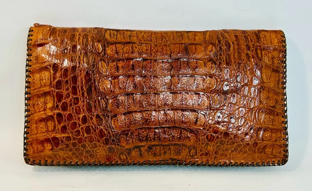 Mid century, 1940’s era, genuine alligator skin brown leather clutch. Snap close. Interior has a zipper pocket separating 2 sides. There is some damage and cracking to the leather on both the interior and the exterior at the point where the bag bends and folds over. Not too noticeable and does not affect function, but be aware it’s there and to handle with care. Approx 13.75” x 7.5”
