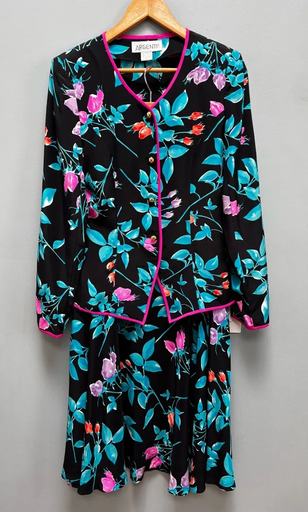 100% silk with floral print Skirt waist is 15” Length is 33” Skirt has a side zipper Blazer / long sleeve top: Pit to pit is 17 1/2” Waist is 14 1/2” Length is 24” Pristine condition