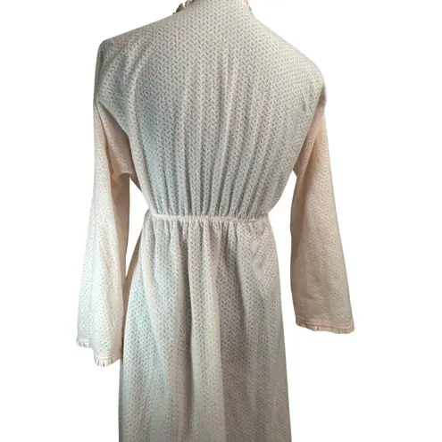Lovely vintage Miss Elaine nightgown in a soft blush pink, 1970s. Features a romantic empire waist with elastic gathering, delicate satin ruffle trim at the neckline and sleeves, and a long flowing silhouette. Made from a soft, sheer brushed nylon fabric (not silky), it’s cozy and feminine — perfect for vintage loungewear lovers, bridal trousseaus, or cottagecore styling. 🩷 Details: • Brand: Miss Elaine • Era: 1970s • Color: Blush pink • Fabric: Soft brushed nylon or nylon blend • Neckline: V-neck with ribbon detail • Sleeves: Long • Closure: Pull-on • Style: Empire waist, long maxi length • Size: Small (tagged) • Condition: good vintage, no flaws 📏 Measurements (taken flat in inches): • Chest (armpit to armpit): 17” • Waist (unstretched): 10” • Back length (shoulder to hem): 54” All measurements are taken flat lay in inches. Please message me with any questions.