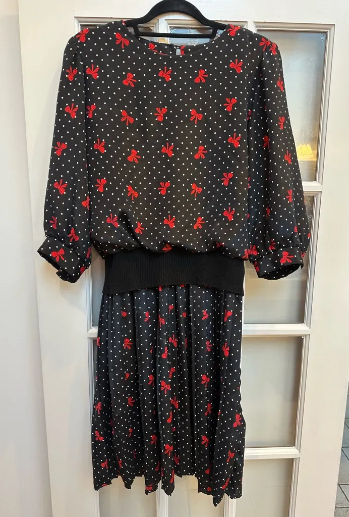 This chic black dress features vibrant red bow accents, offering a stylish and sophisticated look. Perfect for any occasion. Excellent vintage condition, no flaws Size tag missing however measurements posted, measures as a medium Super stretchy elastic waistband Pull over style Smoke free home