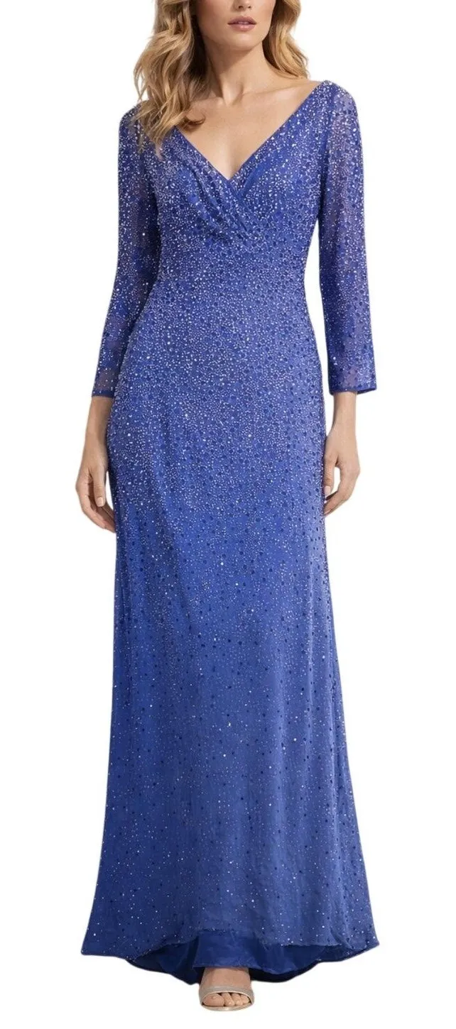 Very good pre owned condition - very tiny area on back near zipper where there is beads missing, not very noticeable Pink hue sequins and beading throughout Sheath silhouette Surplice V neckline Long sleeves Back zip closure Lined pit to pit 18" length 55" prom, bridal, wedding, mother of bride, military ball, formal, versatile, sexy, glamour