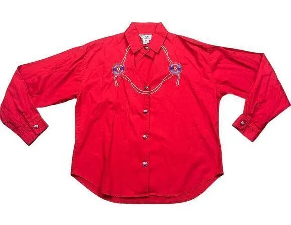 Discover the timeless charm of the Mona by T-W Westerns Button-Up Shirt in a striking red. This women’s long sleeve shirt features a solid pattern and a classic point collar, perfect for casual outings or adding a touch of Western flair to your everyday look. The embroidered accents add a unique touch, while the regular fit ensures comfort throughout the day. Made from soft, breathable cotton, this shirt is ideal for any season—fall, spring, summer, or winter. Machine washable for easy care, this vintage piece is a versatile addition to your wardrobe. Keywords: Mona by T-W Westerns, women’s button-up, long sleeve, red shirt, Western style, embroidered accents, casual wear, vintage, cotton shirt, machine washable, point collar, solid pattern, regular fit, all-season shirt, country. Brand: Mona by T-W Westerns Size: M Sleeve length: Long Sleeve Department: Women Color: Red Type: Button-Up Pattern: Solid Theme: Western Closure: Button Accents: Embroidered Material: Cotton Fit: Regular Collar style: Point Neckline: Collared Vintage Occasion: Casual Season: Fall, Spring, Summer, Winter Garment care: Machine Washable