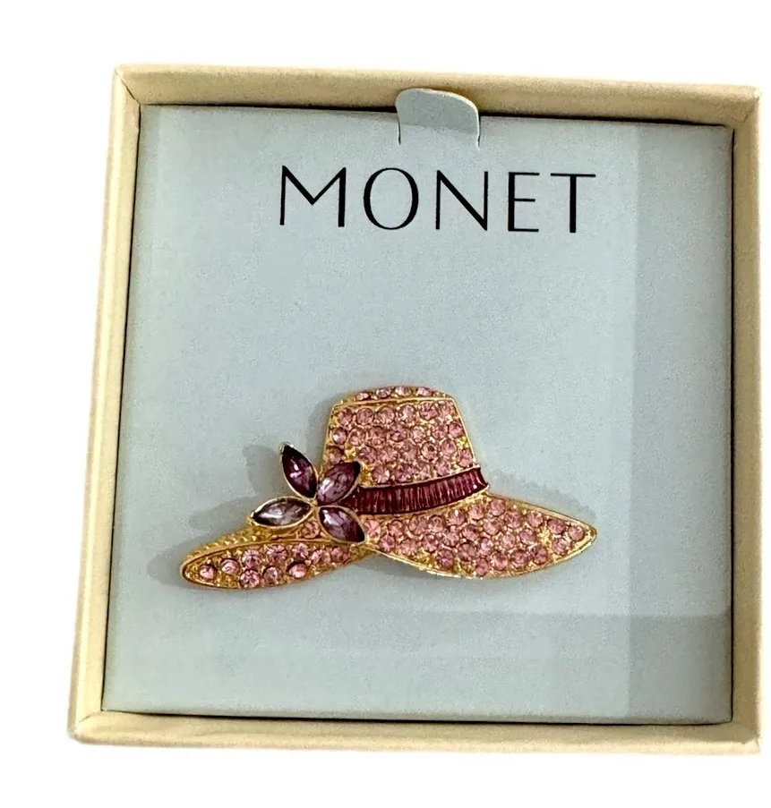 Elevate your accessory game with this vintage MONET Signed Pink Rhinestone Gold Plated Hat Brooch Pi... Show more