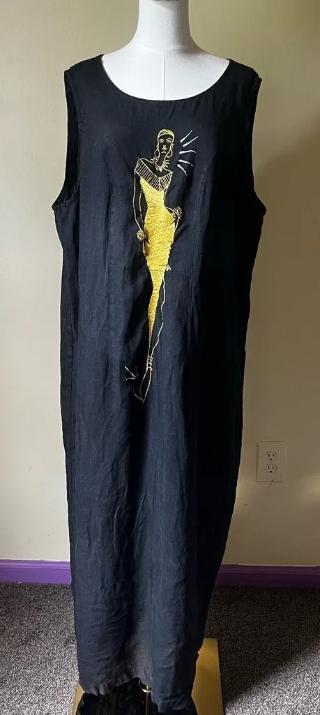 // Please check measurements before purchasing — vintage sizing varies. Striking vintage 1990s Mosato 100% linen maxi dress featuring a bold gold embroidered abstract woman motif. Crafted in a black sleeveless silhouette with a relaxed, oversized bohemian cut. Effortlessly wearable as art-to-wear or elevated summer resort style. Back zip closure and soft drape give it a flattering, flowy feel. Designer: Mosato Size: 3X Material: 100% Linen Condition: Gently used — light normal wear consistent with age Measurements: Pit to Pit 24" | Waist 23" Hip 26" | Length 54" (162) vintage Mosato dress, 90s linen maxi dress, embroidered art dress, Afrocentric fashion, bohemian festival dress, wearable art, plus size 3X, Y2K ethnic style, summer resort dress, black gold linen dress, casual boho maxi