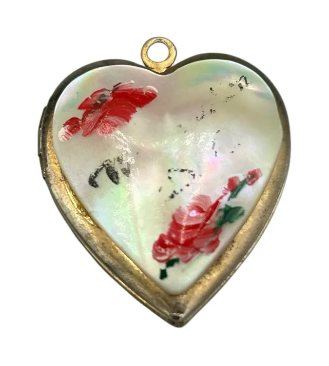 Vintage heart-shaped photo locket pendant featuring an iridescent mother-of-pearl shell front with delicate hand-painted floral details 🌹 ✨ Opens to hold photos or keepsakes ✨ Gold-tone metal with vintage patina ✨ No maker marks ✨ Approx. 5.0 grams A romantic, timeless piece — perfect for layering, gifting, or adding to a vintage jewelry collection. Please see photos for condition details. ⸻ • vintage heart locket • mother of pearl pendant • hand painted locket • floral heart pendant • vintage photo locket • sentimental jewelry • romantic vintage necklace • heirloom style jewelry
