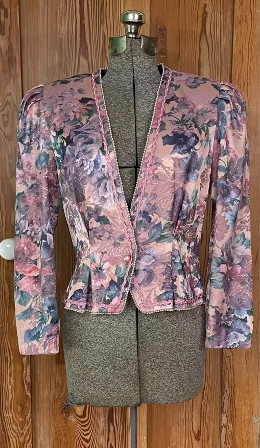 This beautifully detailed vintage Nah Nah Collection jacket is a true statement piece, crafted in a richly textured floral rose brocade with soft mauve, lilac, plum, and sage tones. The fabric features a subtle sheen that catches the light, enhancing the romantic Victorian-inspired floral pattern. The close-up trim work is exceptional — featuring braided corded edging along the front opening, hem, and peplum seams. Lightly padded shoulders give it a structured, elegant silhouette, while the nipped waist and gentle peplum add a feminine, tailored shape. A stunning collectible jacket perfect for cottagecore, gothic romantic styling, art-to-wear looks, or dramatic vintage outfits. Size: Medium Features: Floral brocade, pearl and lace trim, corded edging, Victorian-inspired, puffed shoulders, structured waist, open front, peplum design Condition: Excellent vintage condition with beautiful craftsmanship and preserved details Vintage size 9/10 so please check measurements listed below. All measurements are approximate and from laying flat: Armpit to armpit 19” Shoulder to hem 22” feminine, Cottage-core, cottage, romantic, Victorian, victorian floral, romance, gothic elegance, art to wear, renaissance-inspired, feminine tailoring, statement brocade, romantic vintage, Nah Nah Collection, vintage brocade jacket, floral rose brocade, braided edge blazer, Victorian style jacket, cottagecore floral blazer, romantic vintage jacket, 80s 90s brocade fashion